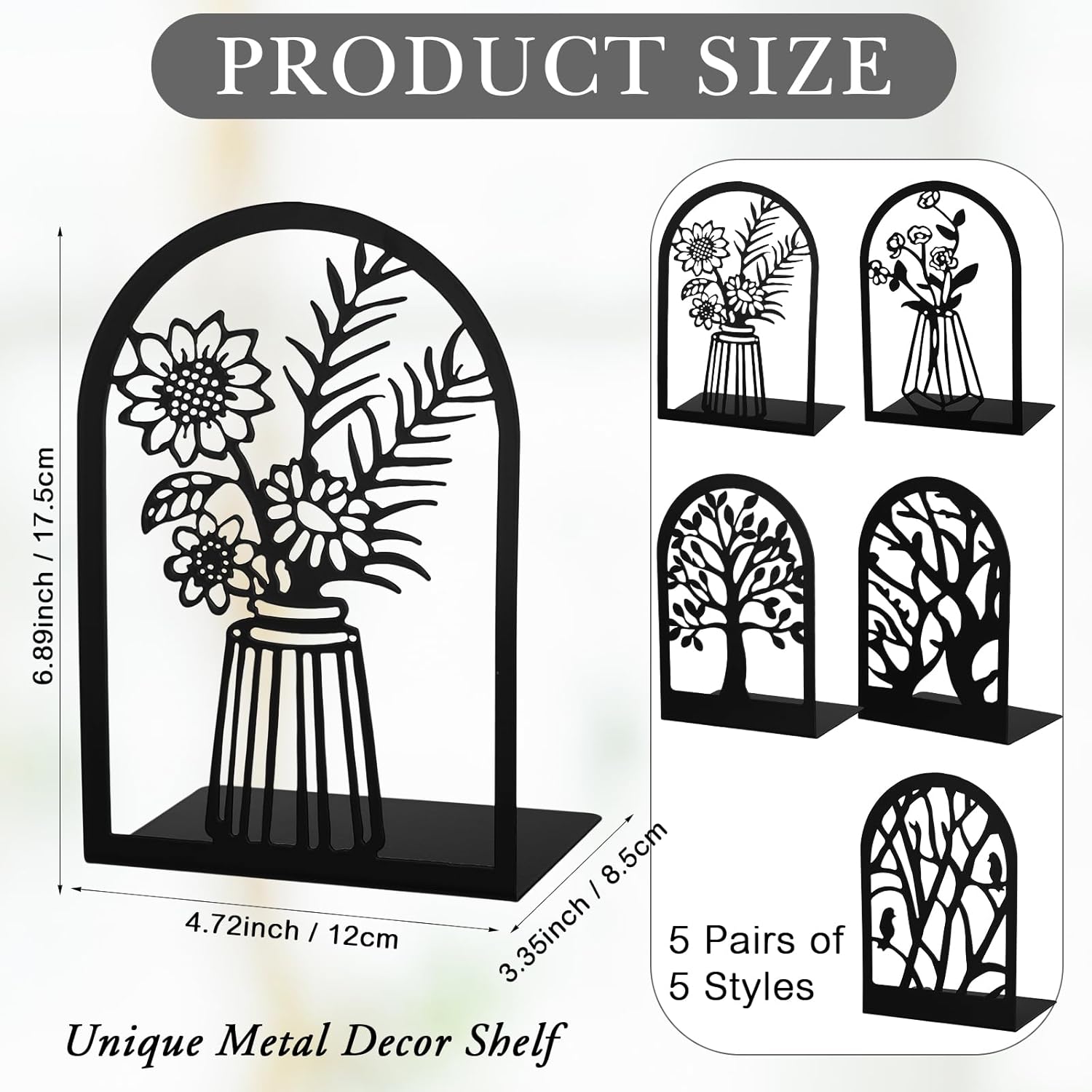 - Value Package: you will receive 2 kinds of vase design bookends and 3 kinds of tree shadow design bookends with different characteristics, 5 pairs (10 pieces) of bookends, sufficient quantity is not only a good helper for organizing books, but also a decoration for home and office, suitable for book lovers