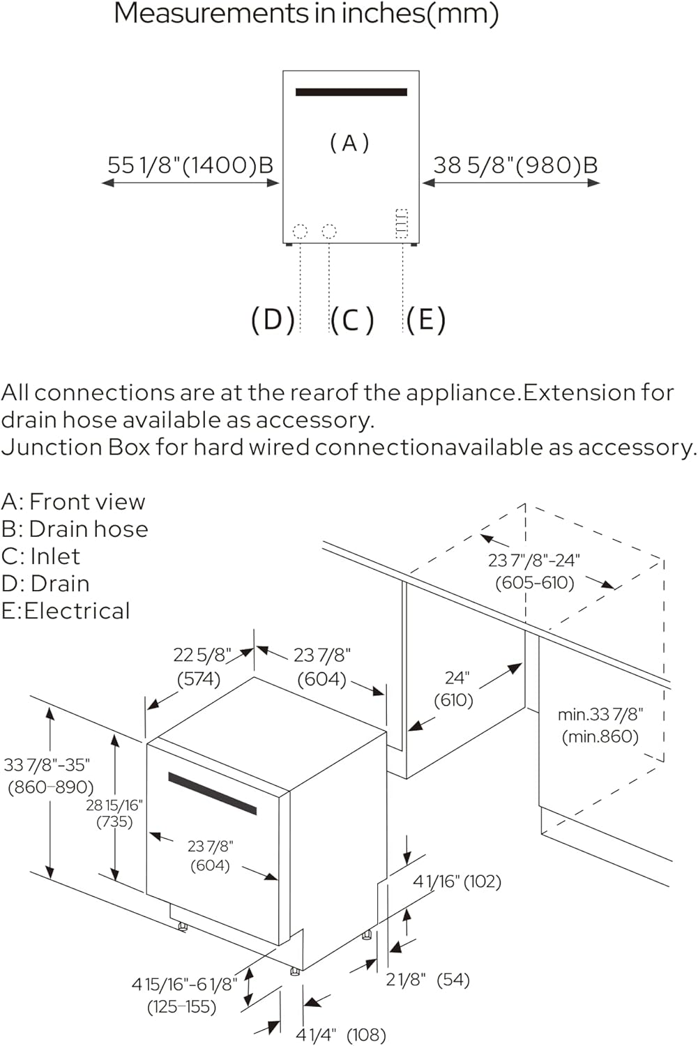 - Dimensions – 33 7/8" to 35” H x 23 7/8" W x 22 5/8" D; Cut-Out: 33 7/8" H to 35” H x 23 7/8" to 24” W x 24" D