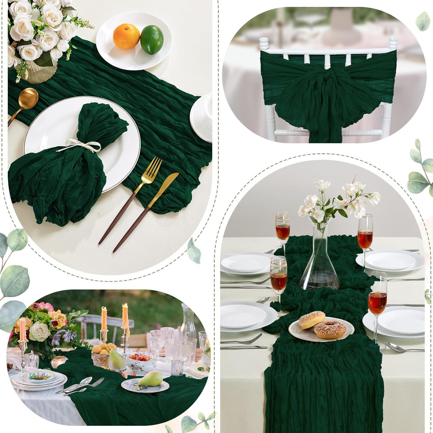 - PACKAGE INCLUDED: You will receive 6 pieces of emerald green cheesecloth table runners. Elegant and beautiful design, exquisite workmanship. Product size: Each boho table runner is 35 x 120 inches. Enough to cover rectangles and round tables, as well as long tables that are stitched together. It can even be used to belt chairs decorate napkins, background curtains. Round or square tables for 8-10 people, perfect for romantic and elegant party events