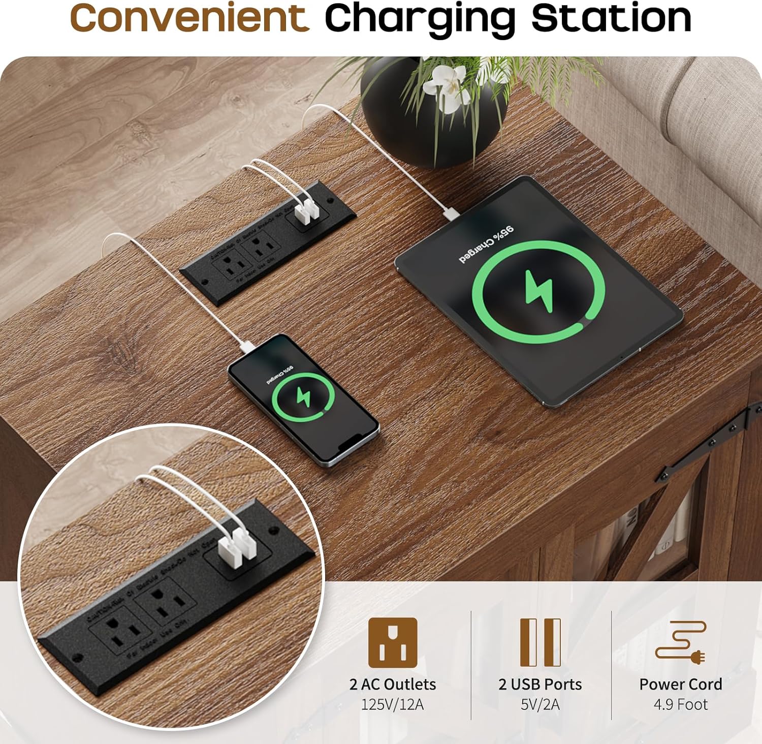 - ăNight Stand with Charger StationăEquipped with 2 AC outlets and 2 USB ports, this white night stand powers up to 4 devices at once, like your phone, laptop, tablet, and lampâalways charged, always ready. The 6.5ft power cord plugs into wall outlets easily, ensuring hassle-free charging.