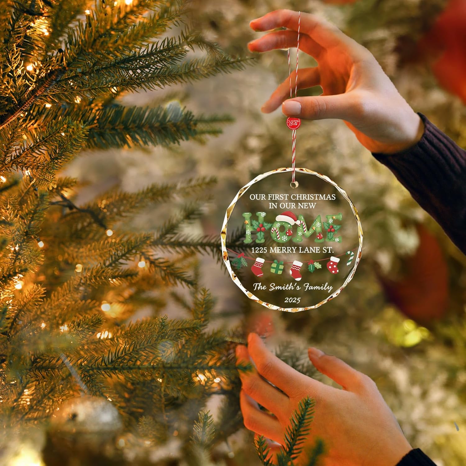 - 🎄️ Versatile Christmas Decorations for Every Space 🎄️ Shine bright this holiday with this crystal our first home ornament 2025! Provided with two hanging cords in red and white to fit all decor styles, this personalized new home ornament is easy and versatile to display on your Christmas tree, mantles, door, window, wall, or anywhere. The premium crystal material creates rainbow reflections when light hits it, making your tree glow like never before